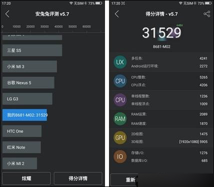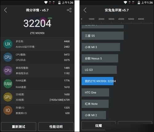 奇酷手机青春版搭载了联发科MT6735八核处理器+2GB运行内存,而中兴威武3搭载了高通晓龙615八核处理器+2GB运行内存,根据安兔兔跑分测试软件发现,奇酷手机青春版跑分成绩为31529万,而中兴威武3跑分成绩近32204万,不难发现这两款机子性能极为接近,不分伯仲。但值得一提的是,奇酷手机青春版的全网通3GB版拥有大内存,售价为1499元,而中兴威武3尊享版同样售价为1499元,内存却只有2GB,这点奇酷手机青春版还是有一点优势的。