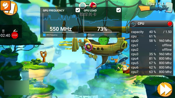 ①休闲小游戏(愤怒的小鸟2):在《愤怒的小鸟2》游戏测试中,骁龙615的Adreno 405GPU平均负载为74%,主频可以一直保持在550MHz;最大内存占用为262MB;实际游戏帧率在20到30帧之间摆动,平均帧率为22帧;CPU部分负载较少,仅为8%,此时骁龙615仅开启了四个小核心外加两个大核,而且都不是满速;游戏中遇到动画场景较为集中的部分会出现由于帧率降低造成的画面卡顿、变慢等情况,但实际操作时的流畅度有所好转,总体的可玩性尚可以接受。