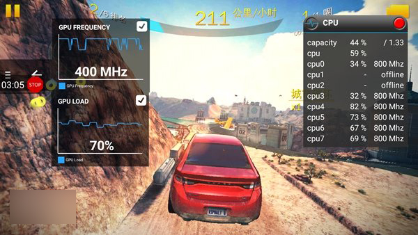 ②大型3D游戏(《真实赛车3》、《狂野飙车8》):TCL idol3在应付这两款大型3D游戏时,Adreno 405 GPU表现的非常局促,占用率高达90% - 100%,《真实赛车3》和《狂野飙车8》两款游戏的平均帧率分别为15帧和21帧,画面卡顿非常显著,基本不具备可玩性。最后,在CPU和内存占用方面,两款游戏分别为9%、316MB和8%、306MB。