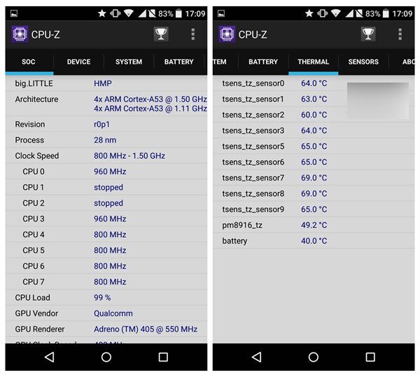 为了模拟大家在日常状况下所遇到的最极端情况,使用可以让CPU 100%满负荷运作的软件对其进行了半小时的连续压力测试,我们发现,TCL idol3对CPU核心的发热控制在70摄氏度左右,达到这一数字后骁龙615会主动进行降频,最终维持在4个小核心(800-988MHz)+2个大核心(960-1113MHz)持续运转的状况,而此时的机身温度最高也就42摄氏度左右,最热位置出现在屏幕上方。