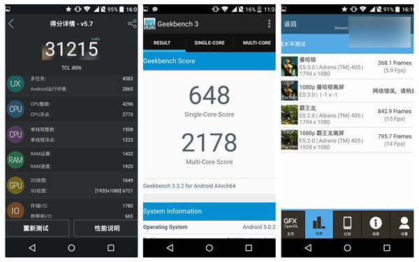 从左到右依次为安兔兔、GeekBench 3、GFXBench。