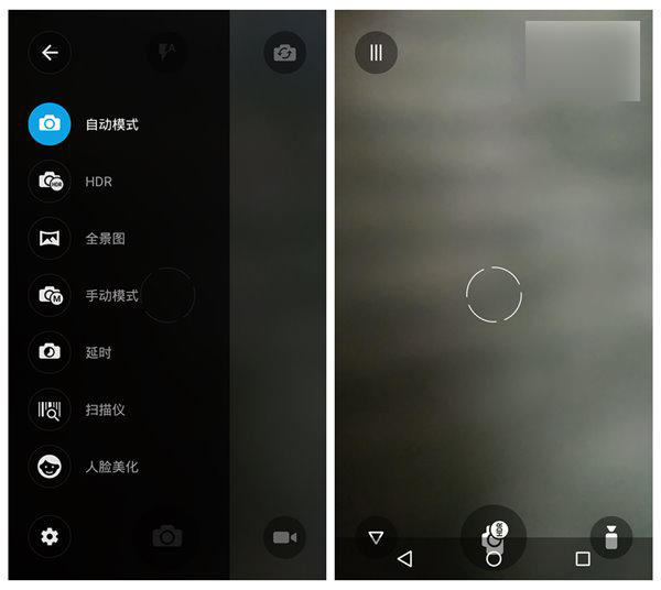 TCL idol3的拍照界面做的十分简洁明了,点击左上方的“汉堡包”按钮或者从左侧向屏幕内部滑动,即可开启相机模式选择,具体功能请参考上图,时下流行的滤镜、先拍照后对焦、慢门(即便是手动模式,最慢快门速度也只有1/2秒)等玩法都不具备,反倒是提供了实用的二维码、条码扫描功能。