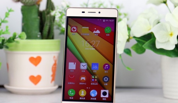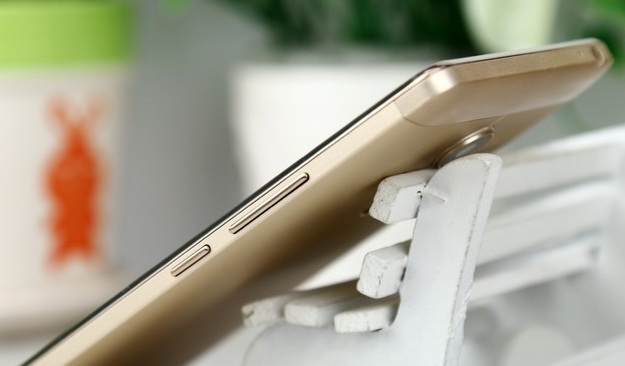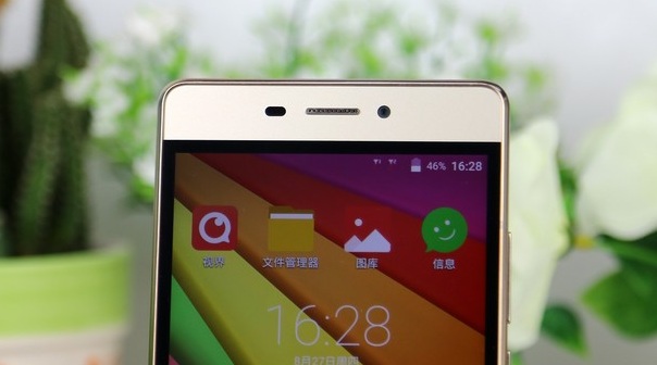 机身正面镶嵌有一圈光滑的金属边框,提升了这款千元机的品味。底部中央Home键两侧是两枚隐藏的菜单键和返回键,两枚按键可以在设置中互换功能。中央的Home键可作为呼吸灯使用,亮起蓝色灯光。