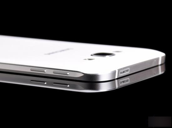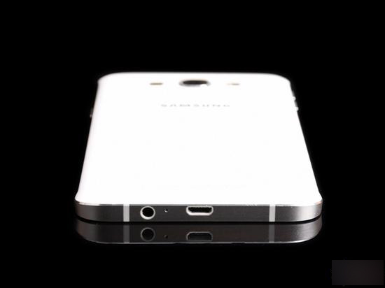 前置镜头、光线感应器和led指示灯分列听筒两侧。听筒下方为银色的Samsung Logo。