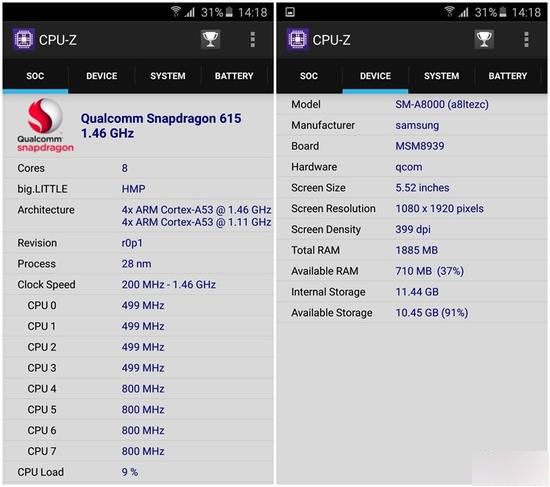 | CPU型号 | 高通 骁龙615(Snapdragon MSM8939) |