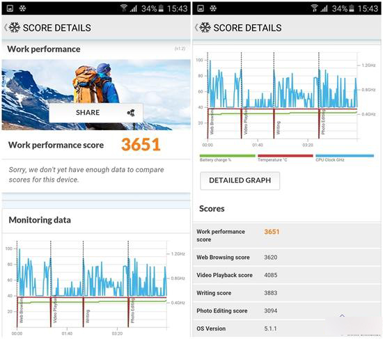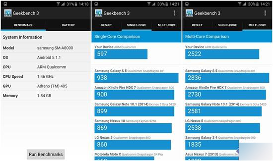这款处理器获得了单核597,多核2522的分数,这个成绩与Galaxy S5已经很接近了。
