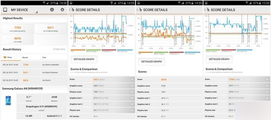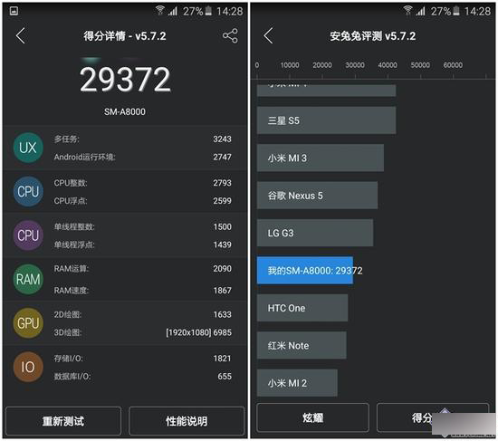 三星Galaxy A8获得了29372的分数,这个数值也是搭载骁龙615设备的正常水准。跑分嘛,我们看看就好。