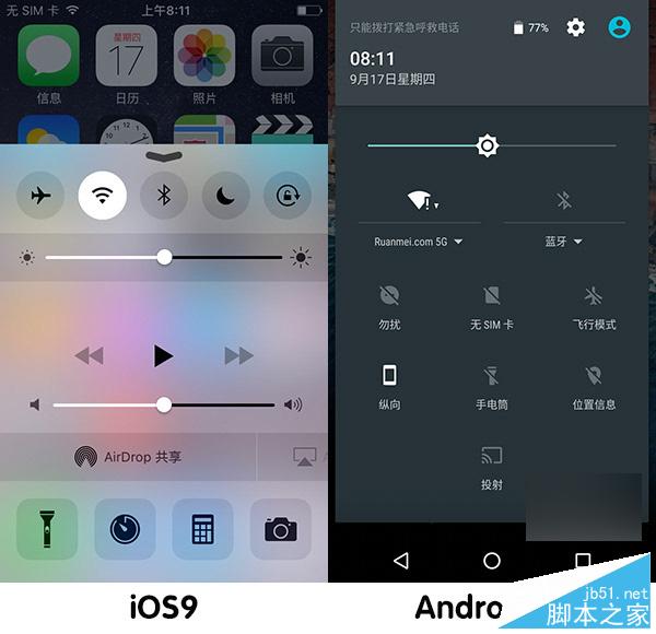 ▲两个系统都是通过下拉查看通知,同时小插件也集成在下拉菜单中,iOS9采用了毛玻璃效果,而安卓6.0下拉后采用了变暗处理,各有风格。