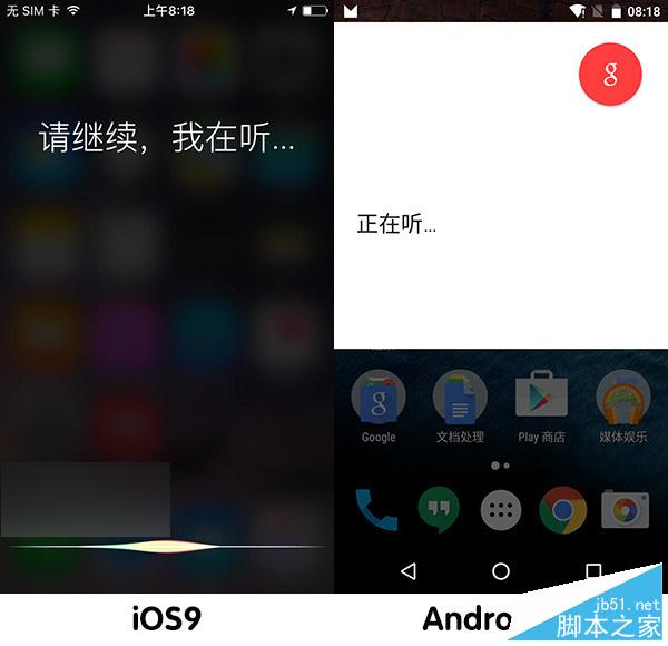 ▲iOS9通过长按HOME键启动siri,然后可以直接与siri对话了。安卓6.0则是通过长按虚拟HOME键启动Google Now直接可发送语音指令,两者的使用都需要联网,Google Now在内地基本属于瘫痪状态。