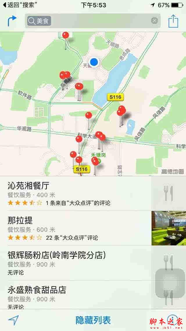 在iOS 8中,打开自带的地图应用,假如要去某个地方,只能显示驾车方案,并没有公交路线导航,需要额外的地图应用才可以进行公交路线导航。虽然iOS 9自带的苹果地图还有许多地方需要优化,但是使用起来感觉比在iOS 8方便多了。打开美食功能时,能跳转到地图应用,并标记出附近的饭店、餐馆等。