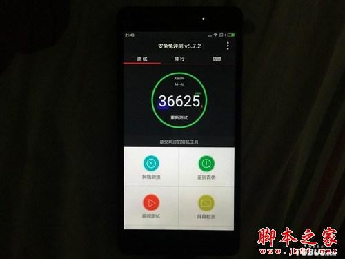 跑分上高通骁龙808自然跑分结果大家都比较清楚了,既然雷军提了我们也不避讳,使用安兔兔跑分给大家公布结果。测试版本为3GB内存高配版本。跑分结果为36625,确实要远超搭载615的4i。排在目前主流的Mate 7、一加、Note4等产品之后。