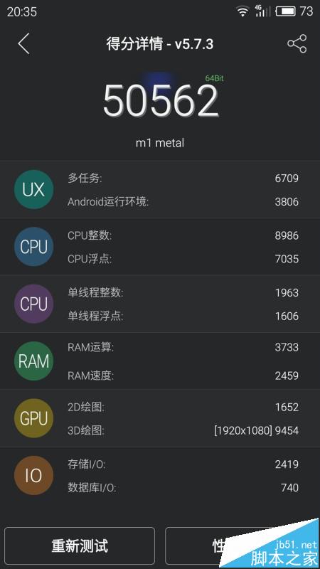 魅蓝metal安兔兔跑分轻松过五万,其中在CPU和3D绘图方面的得分突出。