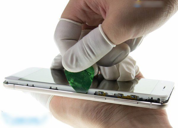 由于vivo x6采用了一体金属机身设计,继续拆机难度相对大家。工程师建议大家从底部的Micro USB接口一侧,用吸盘加上撬片打开一条屏幕缝隙,接着再用撬片加上撬棒沿四周撬开后盖,如图。