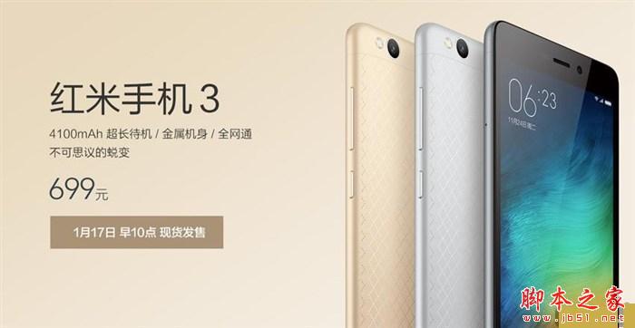 红米3一共有时尚金色、时尚银白、时尚深灰和经典金色四种配色,售价699元,将于1月12日在小米官网(mi.com)、小米天猫旗舰店、小米京东旗舰店、苏宁易购以及全国小米之家同步销售。