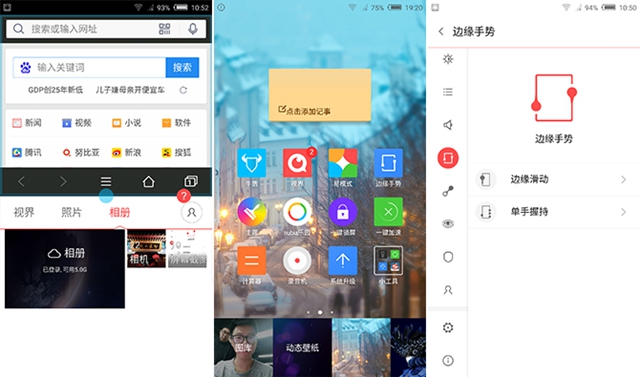 布拉格S依旧延续了努比亚招牌的Fit交互技术,也就是边缘手势功能。不过相比努比亚Z9来说,布拉格S由于没有采用视觉无边框设计,因此无法保留努比亚Z9的Fit交互技术中的全部功能,阉割了握持解锁和横屏双手握持。