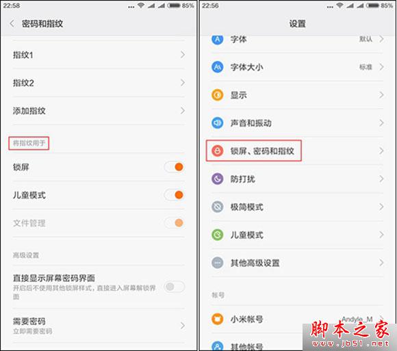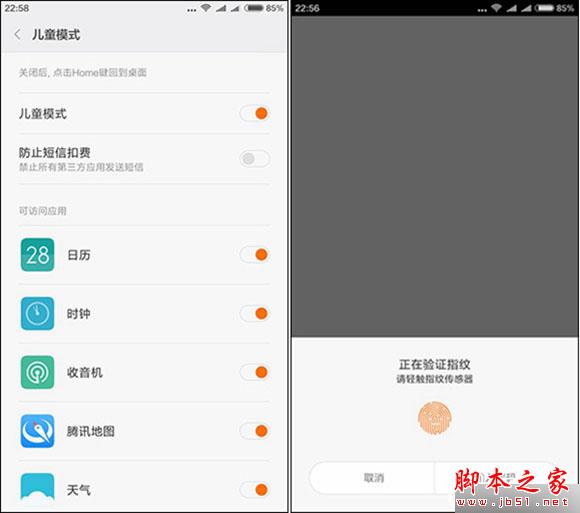 红米Note 3全网通版的儿童模式和指纹识别验证界面