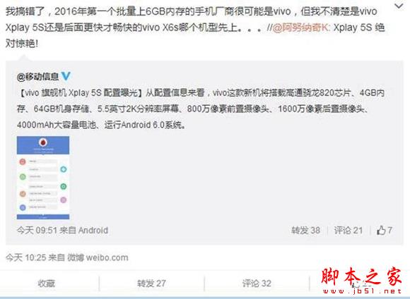 潘九堂表示,vivo可能是第一家采用6GB内存的手机厂商,不过不能确定是在vivo Xplay 5S还是在X6s上面搭载,不过据之前曝光的消息来看,Xplay 5s将搭载4GB的内存,如果采用6GB内存,也将会在以后推出高配版的时候采用。