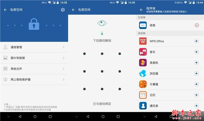 前面所说的指纹以及眼纹都围绕着掌心管家的私密空间和程序锁而作的一层验证保护,加上Android加密机制中的文字图形解锁一共三层加密措施,其中私密空间可对联系人、图片视频、文件以及网上密码进行加密保护,而程序锁就是最为常用的功能了。(程序锁解密之后以下次锁屏为再次加密的标准)