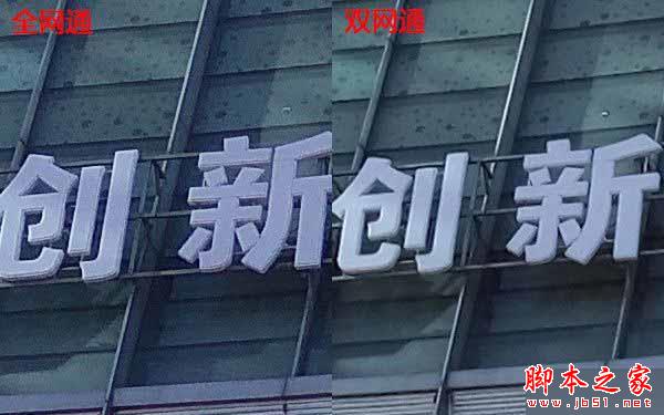 若是将它们的夜景样张100%放大对比,我们则可以发现,红米Note 3全网通版对于红色的表现更加饱满,而且细节处理也要更好一些,比如下图广告牌中的“健”字,而双网通版对于白色的呈现又更具优势,如广告牌中的底色。