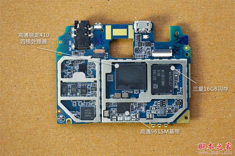 这一面的屏蔽罩都可以打开,除了熟悉的高通骁龙410处理器和9615M基带,同样来自大厂出品的还有三星闪存,容量16GB。