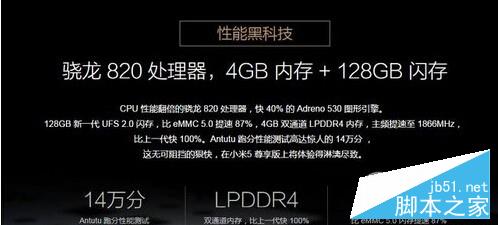 小米5搭载骁龙820处理器/4GB内存+128GB闪存/4轴防抖相机/3D陶瓷机身,同时采用1080P高分辨率的5.15寸屏,支持快充和NFC。