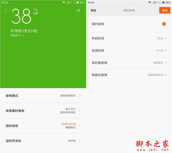 在手机安全中心中,可以查看电量信息并根据需要启动省电模式,其中低电量自动省电是安卓5.0的标配功能,小米4S还多出一个按时省电模式,方便进一步节省电量,这个功能原生安卓就没有。