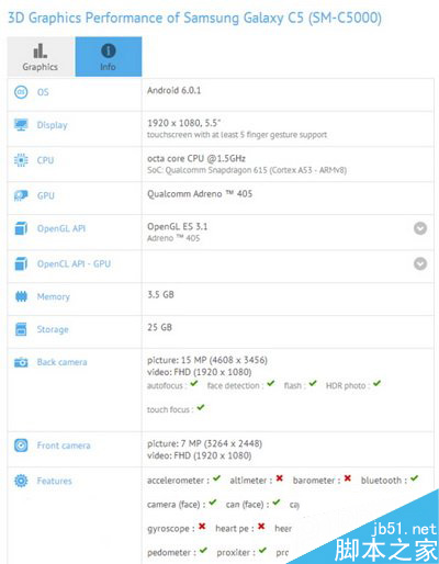 目前GFXBench上已经出现了三星galaxy c5的数据,数据显示该机将采用5.5英寸1080P显示屏,而不是之前传闻的5.2英寸,另外该机搭载骁龙615处理器,采用Adreno 405 GPU,内置4GB RAM+32GB ROM,并采用800像素前置摄像头和1600万像素后置摄像头。