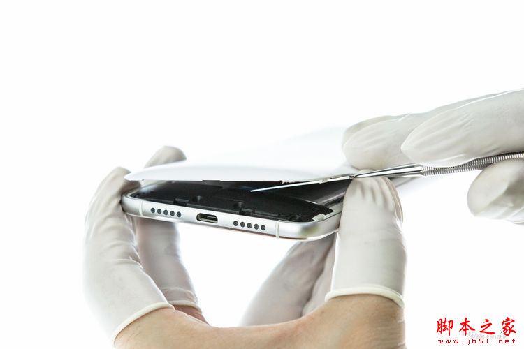 ▲先用吸盘从手机后盖上用力吸开一条缝,再用撬棒从侧面缝隙进入,上下滑动;划开一侧后,再小心划开上下侧,分离后盖