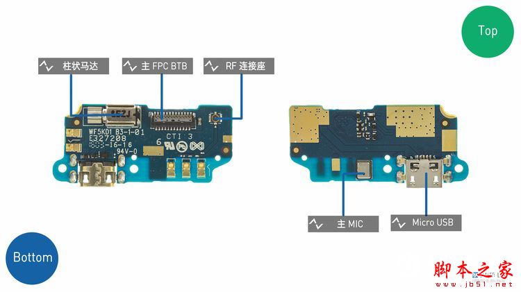 ▲断开各处的 BTB/ZIF 分别是: ① 电源 ② 主 FPC ③ 屏幕 ④ 侧键 ⑤ TP