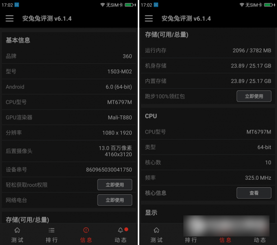 360手机N4是一款千元机的高性价比机型,其外观类似于之前的F4,其整体看起来还不错。其实,这款新机给出的口号是畅快,所以在配置方面非常粗暴,之前的联发科十核处理器+4GB内存,这只有旗舰机身上才会具备。在正式评测之前,我们先来大致看看360手机N4硬件配置情况。