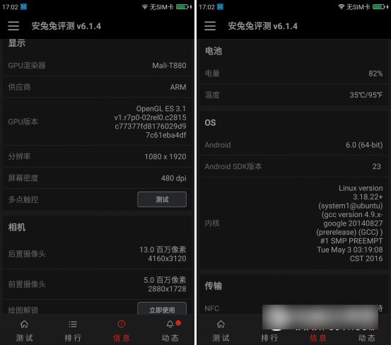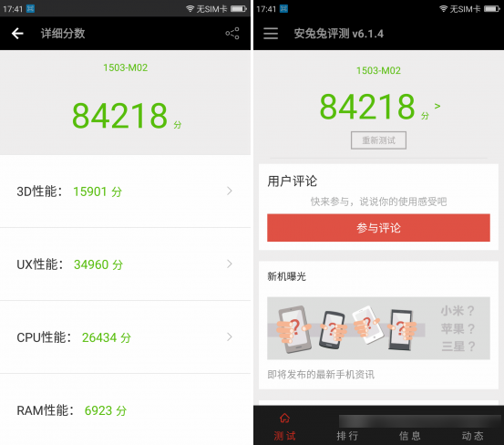 通过安兔兔测试,我们得知这款360手机N4跑分成绩达到了8.4万,其成绩是非常理想的,通过脚本之家小编以往的判断来说,这款360手机N4的性能满足日常使用是绰绰有余的,对于一般的3D游戏或者1080P视频也是毫无压力。