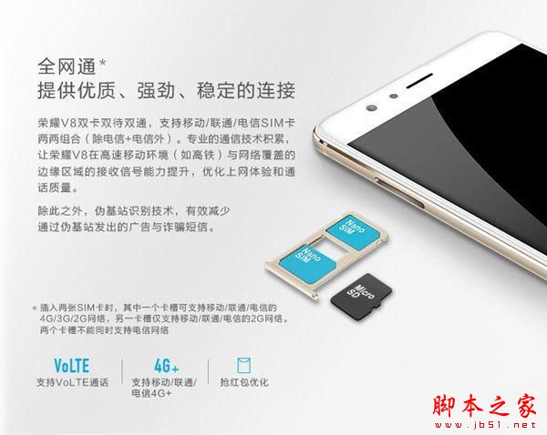 网络方面,荣耀V8拥有运营商定制版和全网通版,支持双卡双待,网络涵盖非常全面。而且我们知道华为是一家通信公司,所以这款荣耀V8支持高铁模式,支持天际通,支持VoLTE、支持4G+等,在网络方面非常给力。