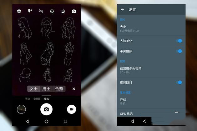 TCL 750的相机界面设计简洁,Pose美姿和构图辅助线算是两个比较有特色的功能点(可以帮助摄影小白提高构图技巧)。前置800万摄像头可以监测到“V”手势自动拍照(不过识别率略低而且也不能老用剪刀手啊),并具备基本的美颜调节功能。