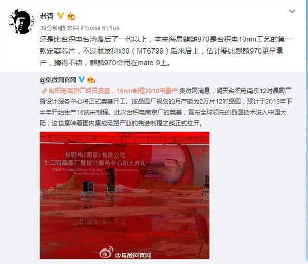 此外,老杳还在微博上强调,麒麟970会用在Mate 9上。