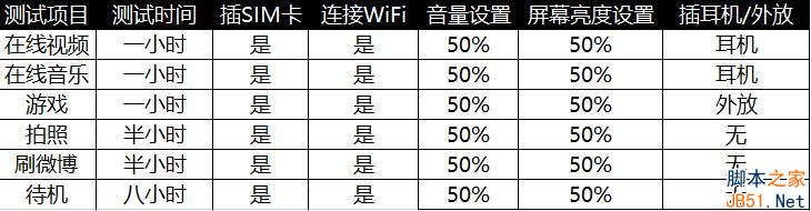 续航方面我们选择了四小时的连续续航测试以及八小时的待机测试。第一部分主要包括一小时的在线视频,一小时的在线音乐,一小时游戏,半小时拍照以及半小时刷微博。下面我们通过一张表格展示一下各项测试中的手机设置情况。