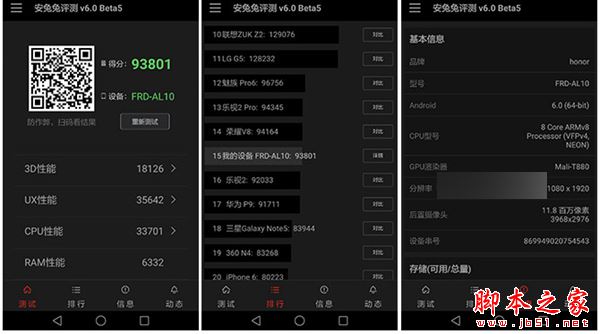 从跑分测试可以看出,荣耀8安兔兔跑分达到了9.3万分,性能达到了今年旗舰机高端水平。