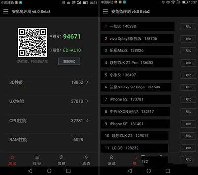 性能方面,荣耀V8和Note8搭载了相同的麒麟955八核处理器,同样是4GB运行内存,而对于一部手机而言,决定其核心硬件的硬件就是处理器与RAM内存,因此在性能方面,荣耀Note8和V8基本是一样的,通过安兔兔跑分测试,这两款手机跑分都在9.5万分左右。