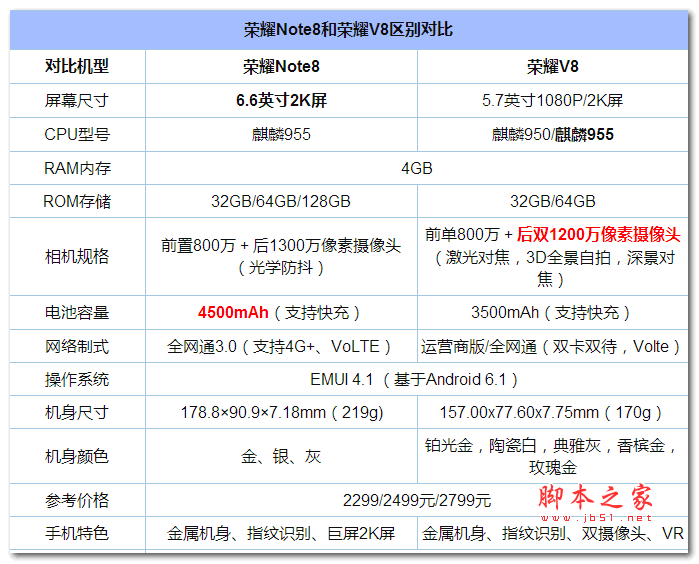 为了减少价格、网络制式方面的干扰,本次我们对比的荣耀Note8和荣耀V8高配版,两者在硬件方面区别如下。