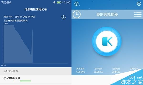 荣耀V8自带的电源适配器支持5V/2A和9V/2A两种充电模式。为了方便计时,这次充电时间从21:00开始,当荣耀V8连接上充电器之后,用另一款手机打开智能插座的APP来显示充电时的实时功率和所耗费的电能。(注:智能插座APP中显示的“当前电流”和“当前电压”指的是插座的交流电,而不是手机电源适配器的直流电。)
