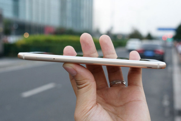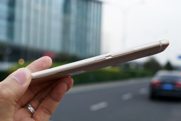 魅蓝E的机身三围为153.6*75.8*7.9mm,重量为172g,这一数据在对比大多5.5寸屏的手机来说,大小尺寸基本相仿,但重量略沉,拿在手里有些压手,整体手机不及魅族MX6,主要原因在于中框下边增加了一道CNC工序,不像魅族MX6过渡的那么自然。有得必有失,中框部分的CNC工艺提升了金属质感的同时,也增加一些硌手感。