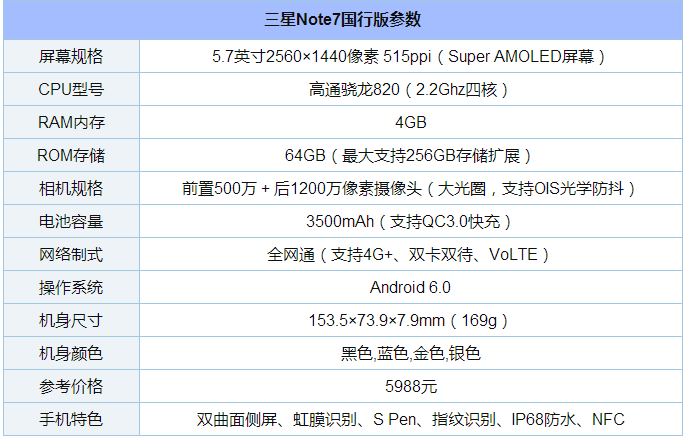 三星Note7珊瑚蓝到这里就结束了,作为时下一款安卓机型产品,三星Note7除了顶级硬件配置外,还融合了诸多黑科技,包括双曲面侧屏、虹膜识别、S Pen、指纹识别、IP68防水、NFC等等,以下是详细参数。
