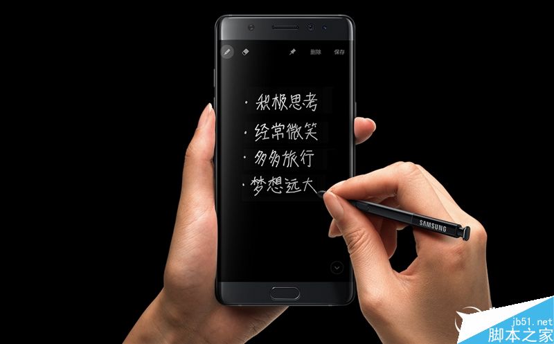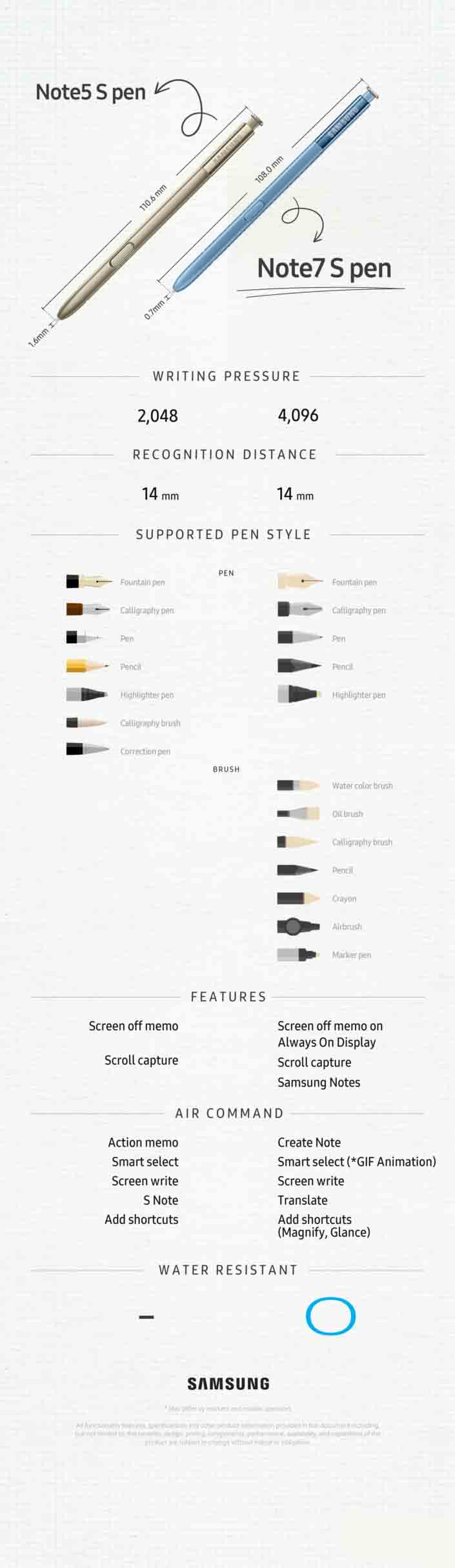 Note 7上的S Pen又进行了大幅度的改进,首先就是和机身一样也支持IP68防水防尘了,这意味着即使在风沙雨雪天气里、洗澡游泳时,你也可以直接拔出笔来写写画画。