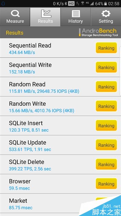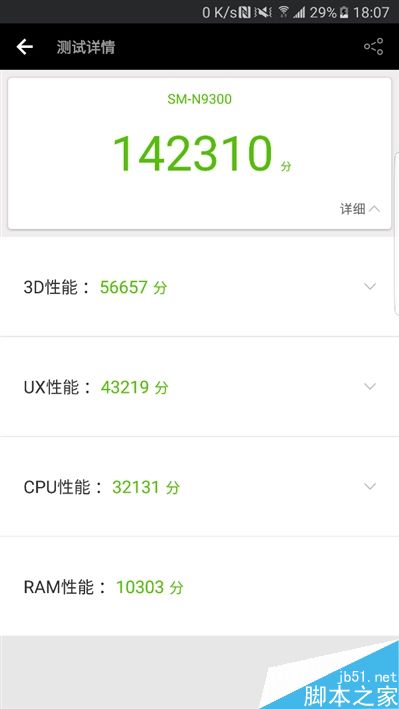 三星已经用了好久的UFS 2.0闪存存储,还解决了与microSD扩展卡共存的问题。AndroBench实测持续读取可达430MB/s左右,持续写入超过150MB/s,随机读取接近30000 IOPS,都很不错,只有随机写入稍低才超过4000 IOPS,因此在写入大量小问题件比如安装较大APP的时候会略微慢一些。