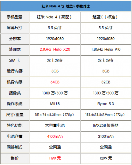 红米Note 4与魅蓝E参数对比