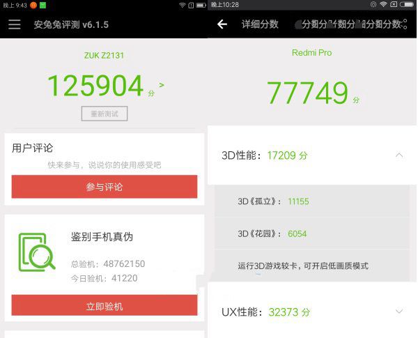 ZUK Z2和红米Pro安兔兔跑分对比