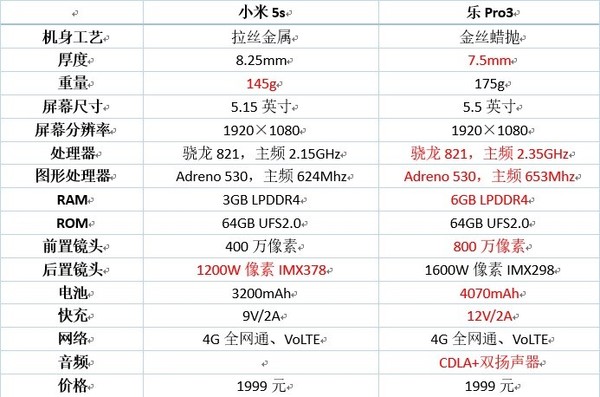 通过参数对比可以看出,1999元的小米5s遇到1999元的乐Pro3还真是处于下风,特别是在小米手机标榜的“发烧”性能上更是完败,同样都是骁龙821处理器,小米5s却是个“阉割版”。CPU和GPU主频都不如乐Pro3,更别说RAM配置上,乐Pro3两倍于小米5s了。