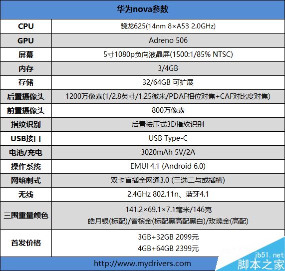 HUAWEI nova采用了高通骁龙625处理器,14nm工艺八核芯片,性能和功耗有很好平衡,同时有3+32GB、4+64GB两种内存存储组合,比起国际版单一的3+32GB选择更丰富,特别是4GB内存的加入要点个赞,毕竟如今很多所谓旗舰手机都还保留着3GB内存。