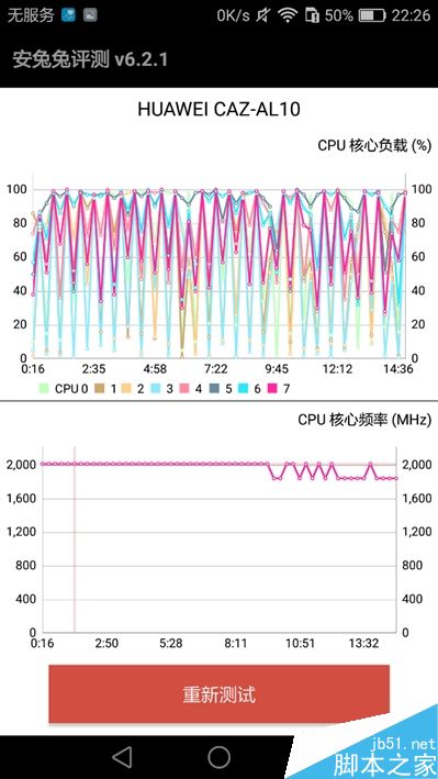八个核心基本都没有闲着,而且有着不同的负载分配。频率方面前9分钟都能稳定坚持在2GHz的最高值,后期则在1.8-2GHz之间波动,效率很高。