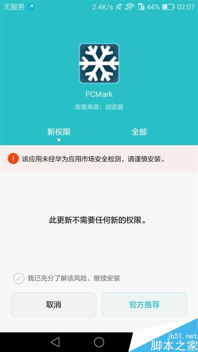 值得一提的是,EMUI 4.1对应用安装的安全性要求十分严格,未经华为市场检测的会默认不予安装,可以选择前往华为市场安装推荐版本,强行安装也会有进一步的风险提示。这一点做得非常好。