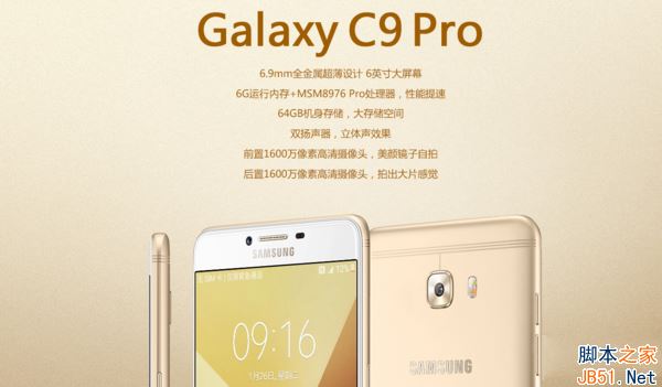 首先谈一下大家最关心的配置,三星盖乐世c9pro搭载6英寸1080p屏幕,使用骁龙653处理器,辅以6GB RAM+64GB ROM,内置4000mAh电池。拍照上,该机前置1600万像素摄像头,F1.9光圈,支持弱光拍摄和美颜功能。后置镜头同样为1600万,支持相位对焦技术。网络方面,支持双卡双待全网通。另外,三星c9pro还配备了前置指纹按键,支持Samsung Pay以及支付宝和微信支付。